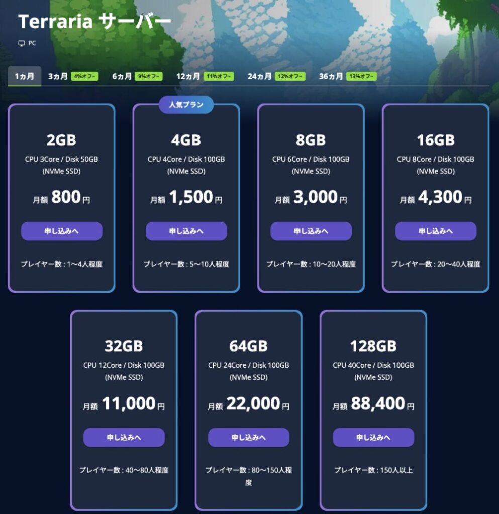 テラリアサーバー対応のプランは2GB〜128GBまで7プラン用意されています。