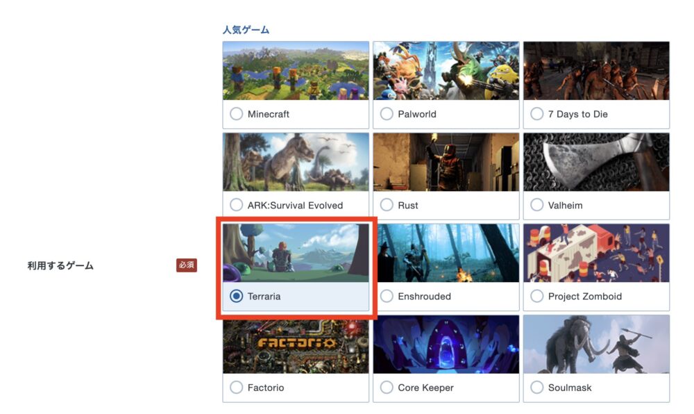 たとえばXServer GAMEsの場合は、こんな画面で申し込むので「Terraria」を選びましょう!